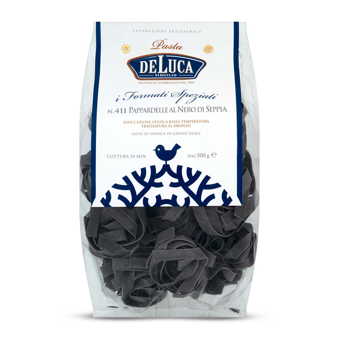 Czarne Pappardelle DeLuca powstaje we Włoszech z idealnie przystosowanej do makaronów mąki z pszenicy durum. Wykorzystanie tego gatunku pszenicy gwarantuje wysoką zawartość białka i glutenu, dzięki czemu makaron jest elastyczny i ma doskonałą teksturę, która świetnie nosi sosy i tłuszcze. Rozmiary wstążek Pappardelle DeLuca to ok. 1,1 cm szerokości i 0,1 cm grubości przed ugotowaniem.
